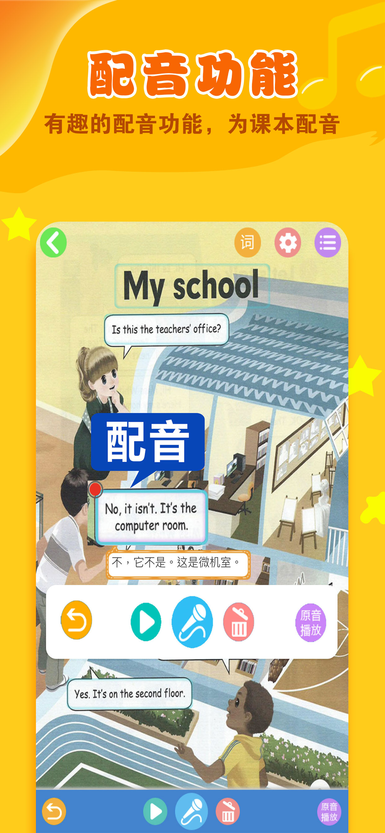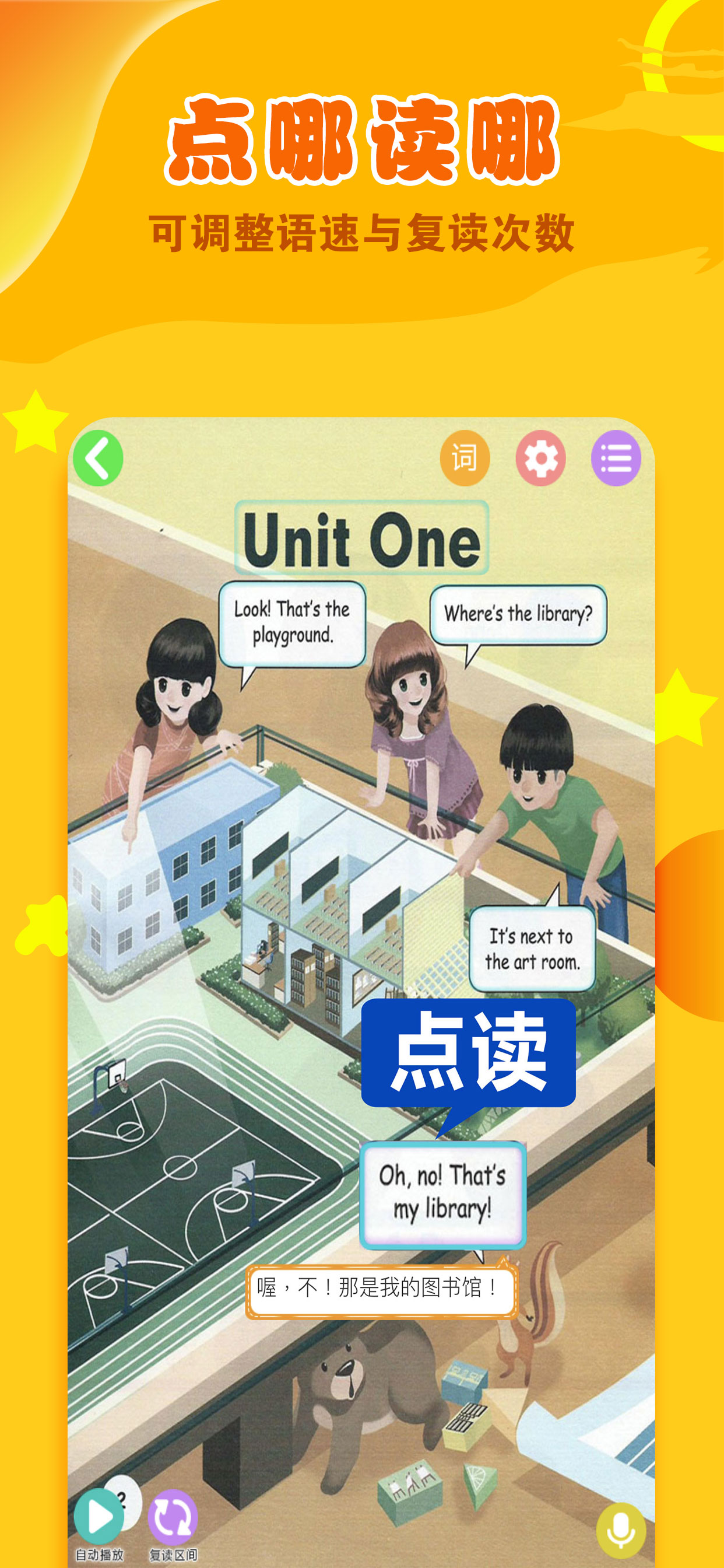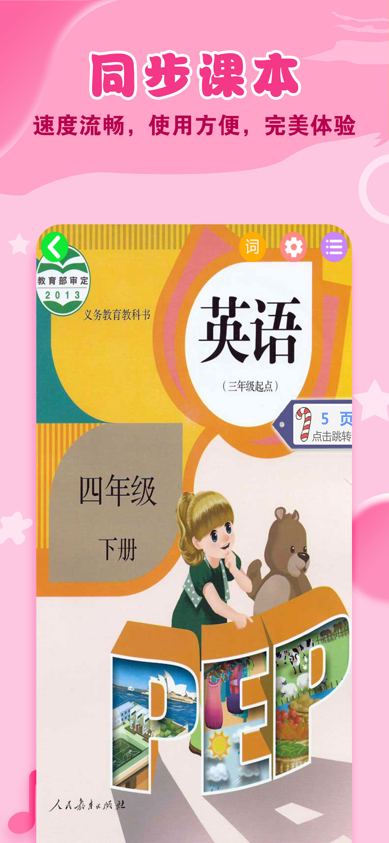 与人教PEP小学英语课本同步,单词,口语,原版声音,爸爸妈妈再也不用愁英语不会读了!灵活选择自己的课程,目前包含最新版小学三年级上册至六年级上册英语课本。