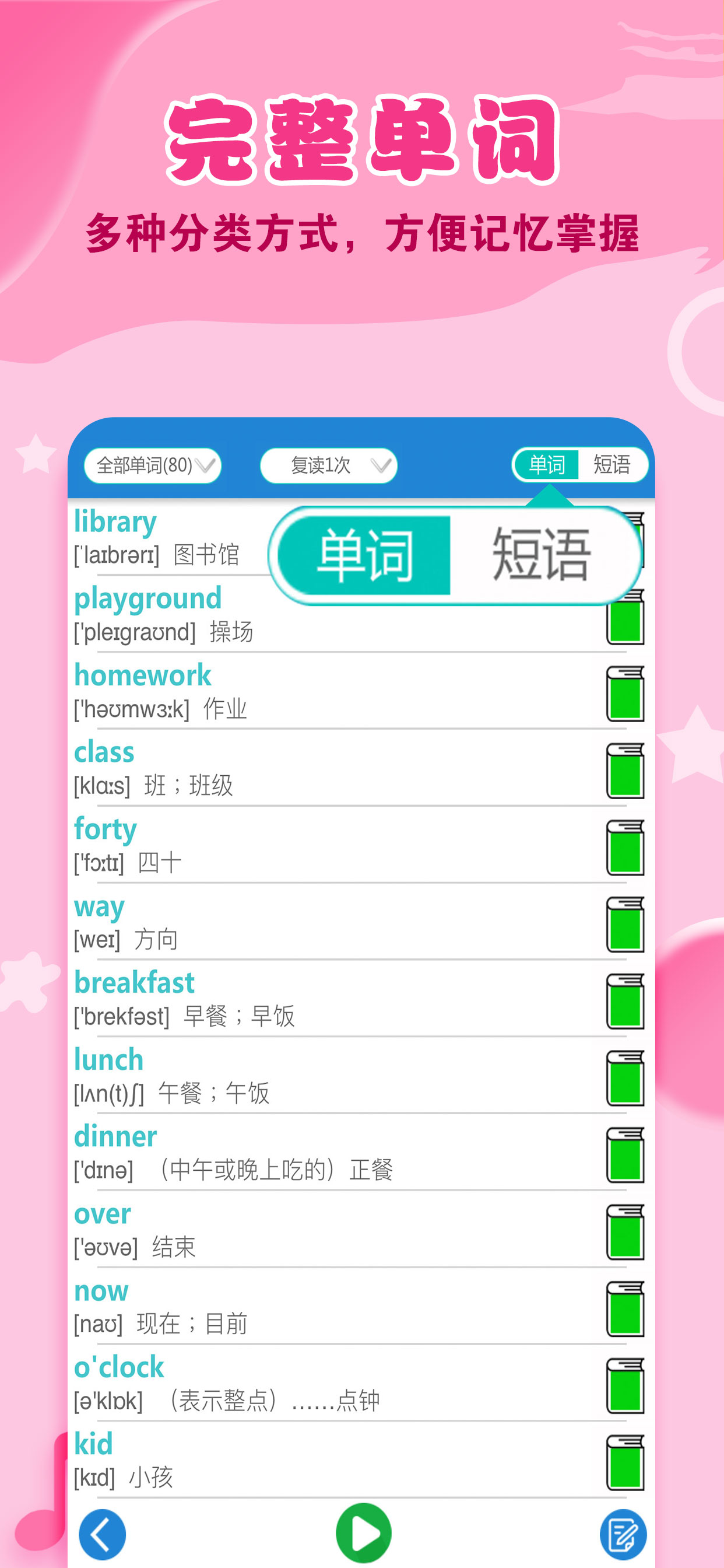·功能齐全——点读复读,单词口语整理完备,记录分析学习情况!