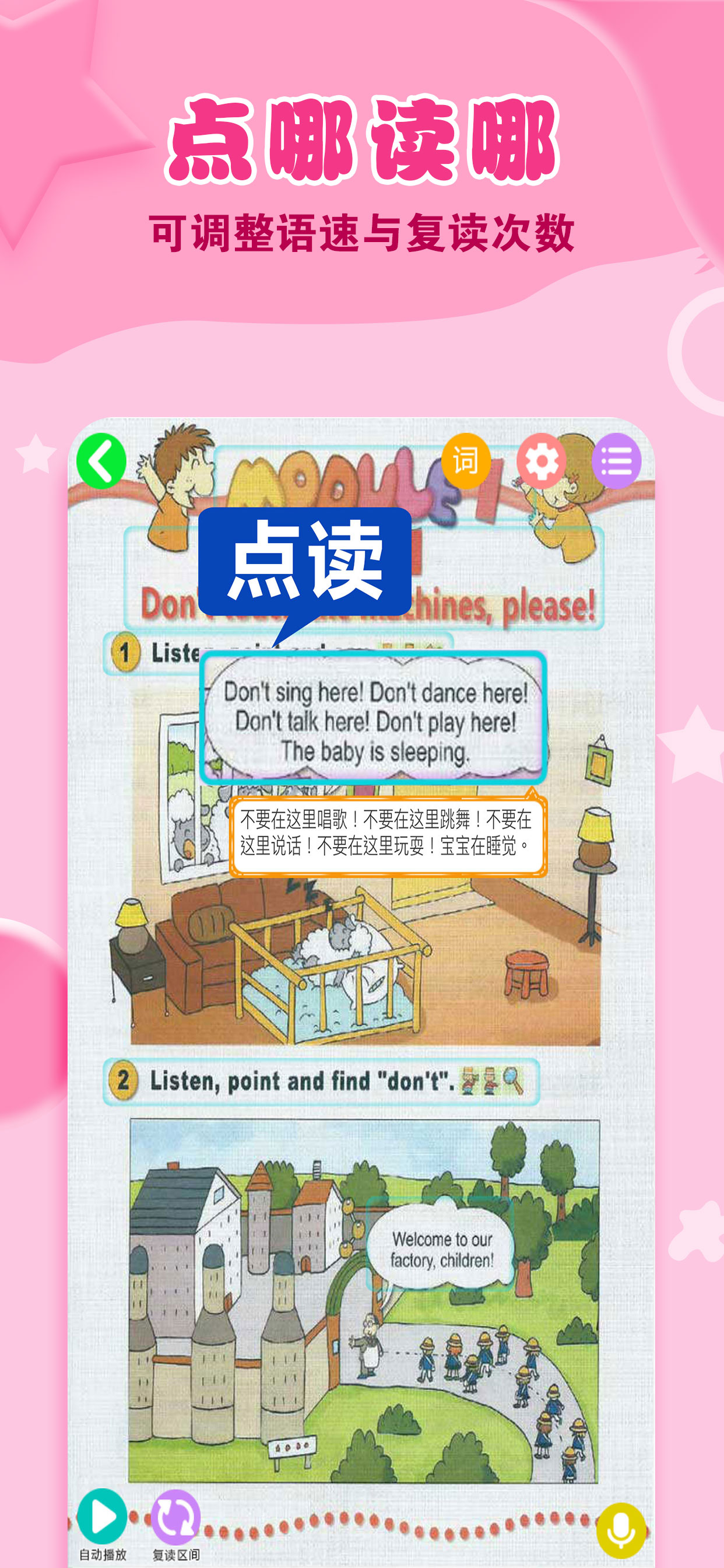 点到哪里读哪里,点读翻译样样行,孩子跟着一起读,让孩子在轻松快乐中学英语。