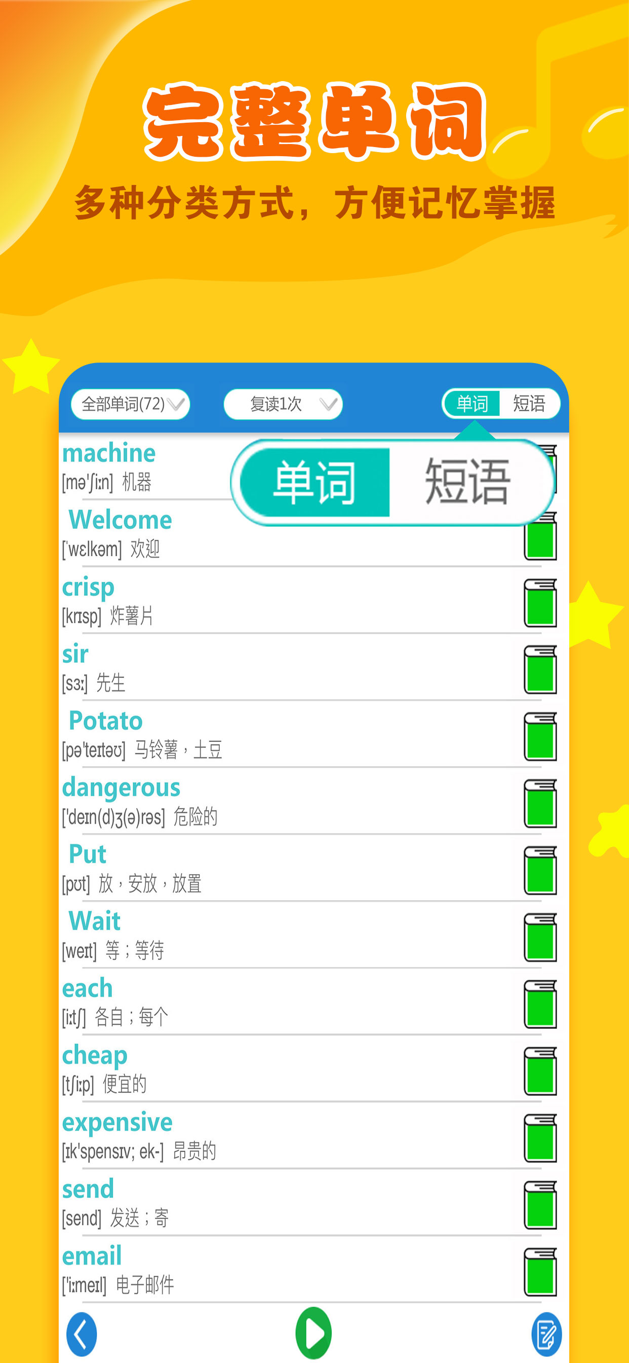 ·功能齐全——点读复读,单词口语整理完备,记录分析学习情况!