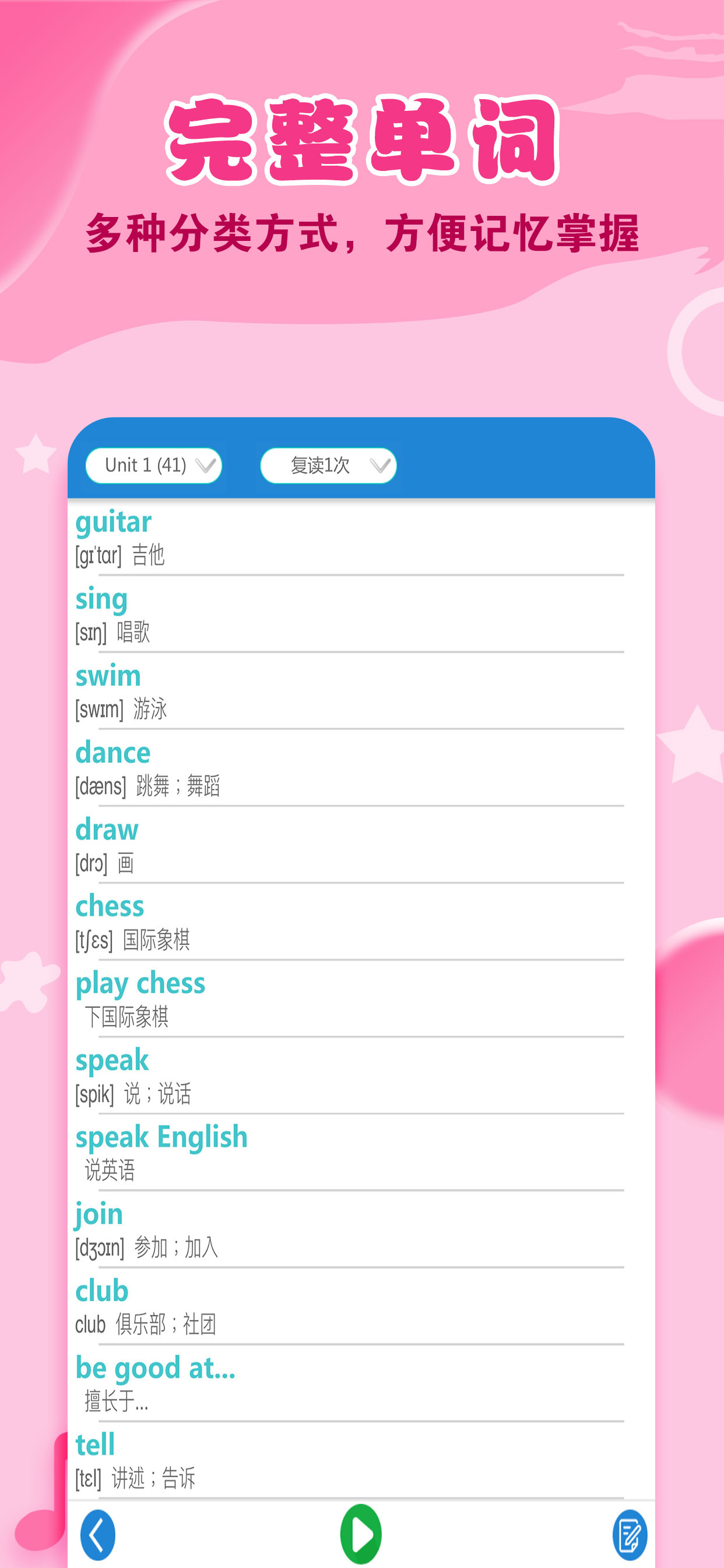·功能齐全——点读复读,单词口语整理完备,记录分析学习情况!