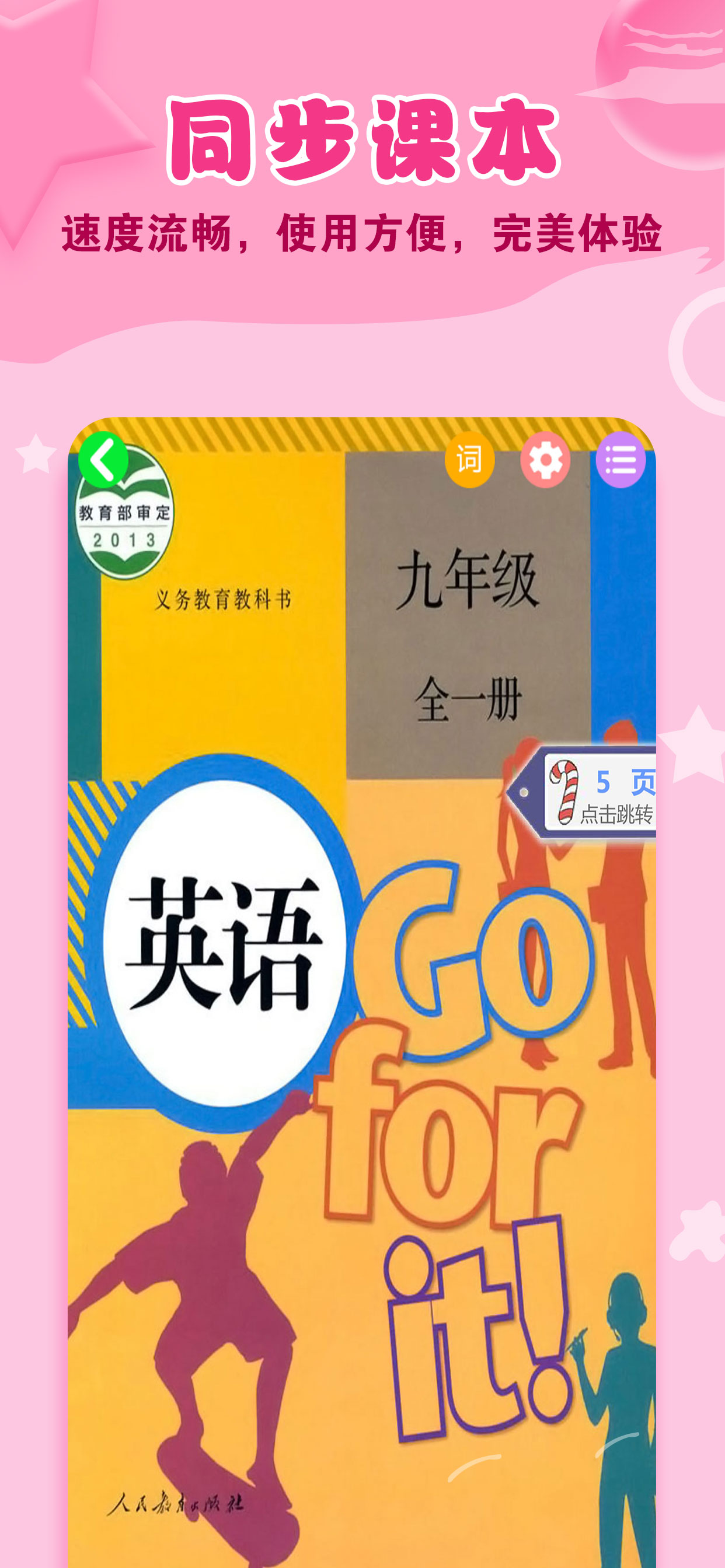 与人教版初中英语课本同步,单词,口语,原版声音,爸爸妈妈再也不用愁英语不会读了!灵活选择自己的课程,目前包含最新版小学九年级全册英语课本。