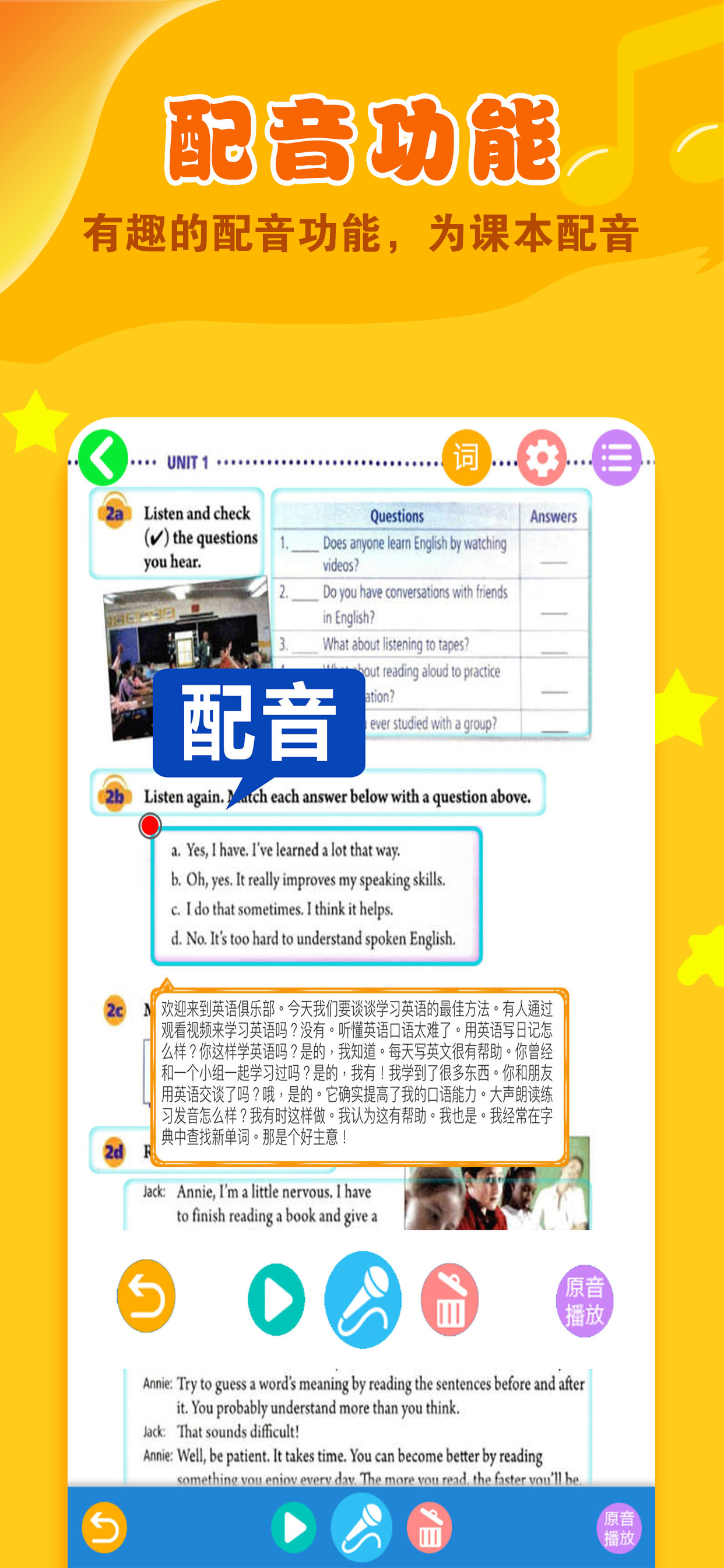 ·趣味互动——录音功能,根据标准发声锻炼孩子的“说英语”,有趣的配音功能,为课本配音!