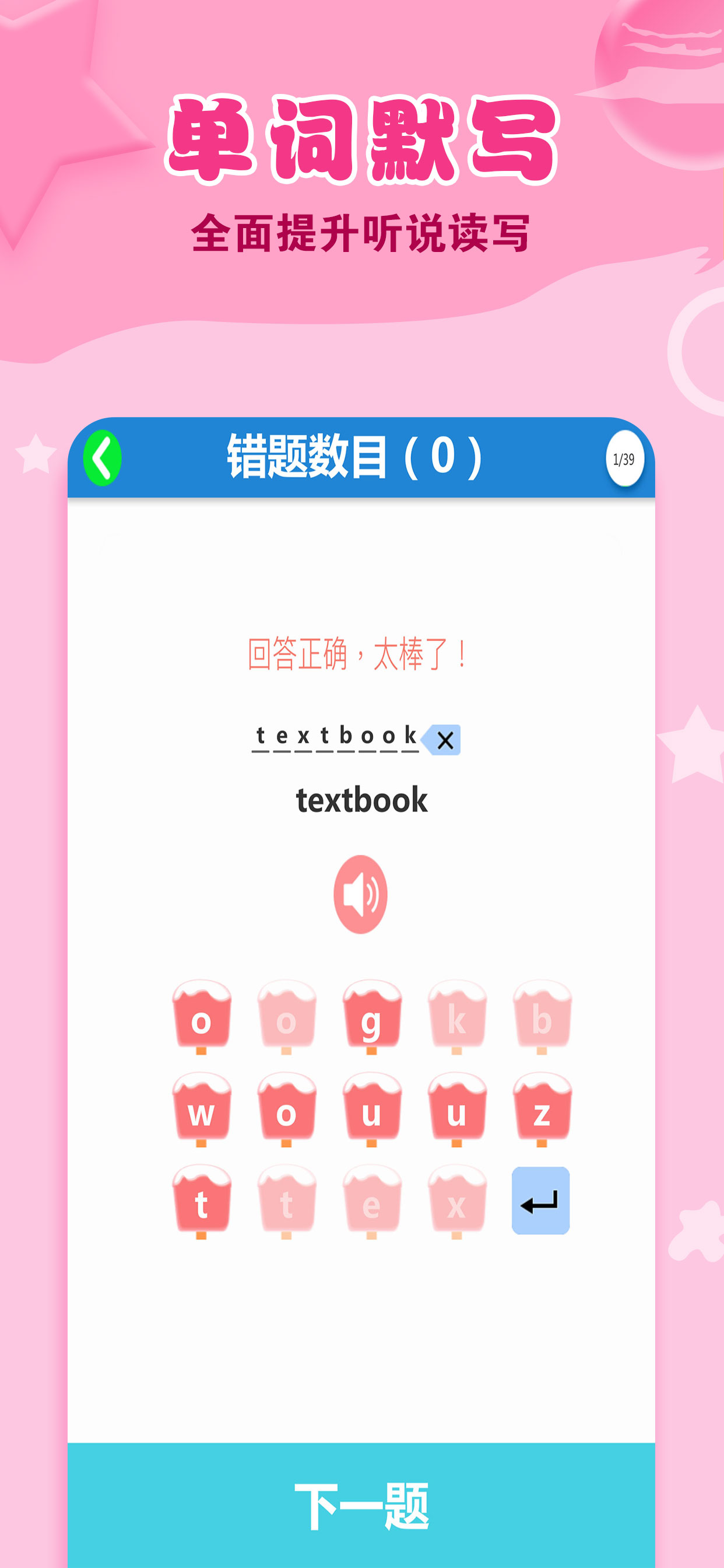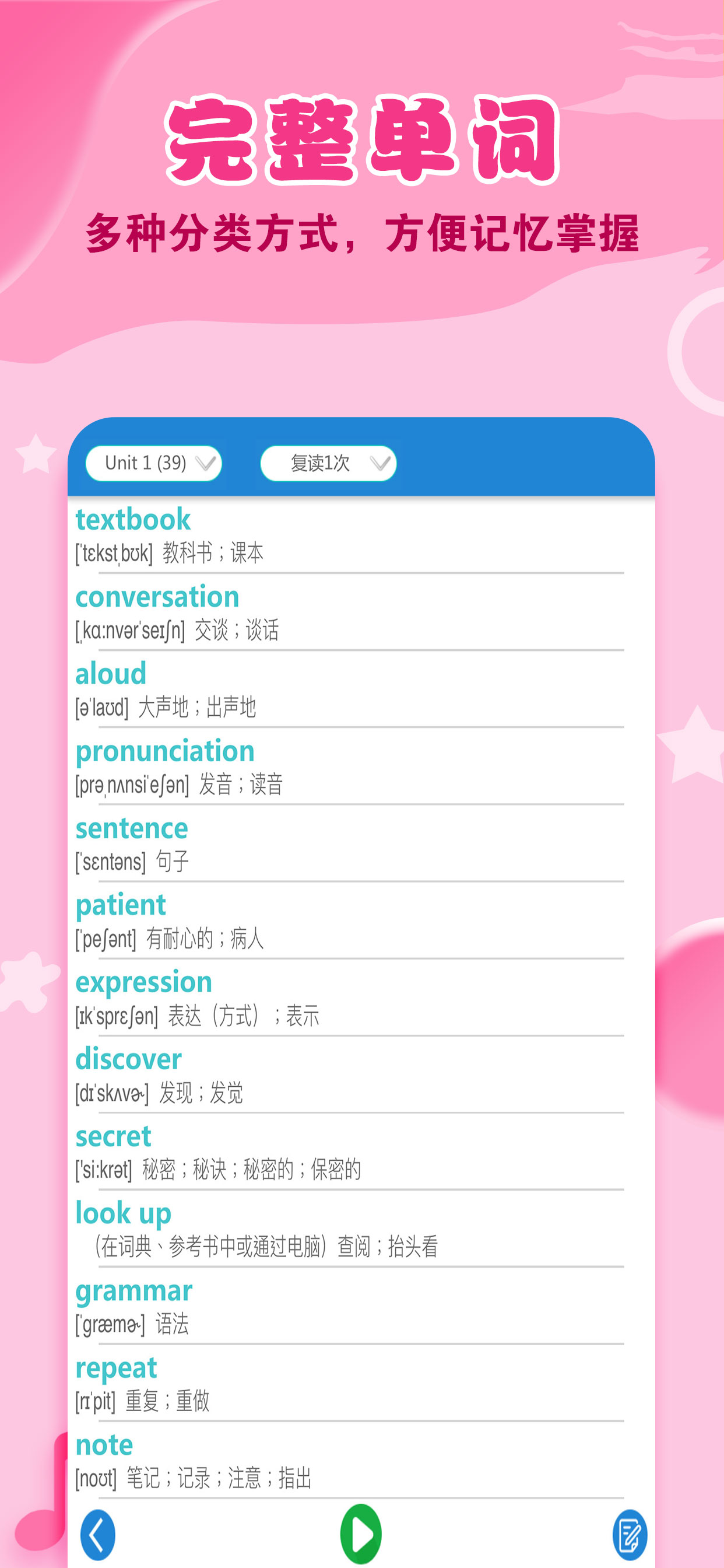 ·功能齐全——点读复读,单词口语整理完备,记录分析学习情况!
