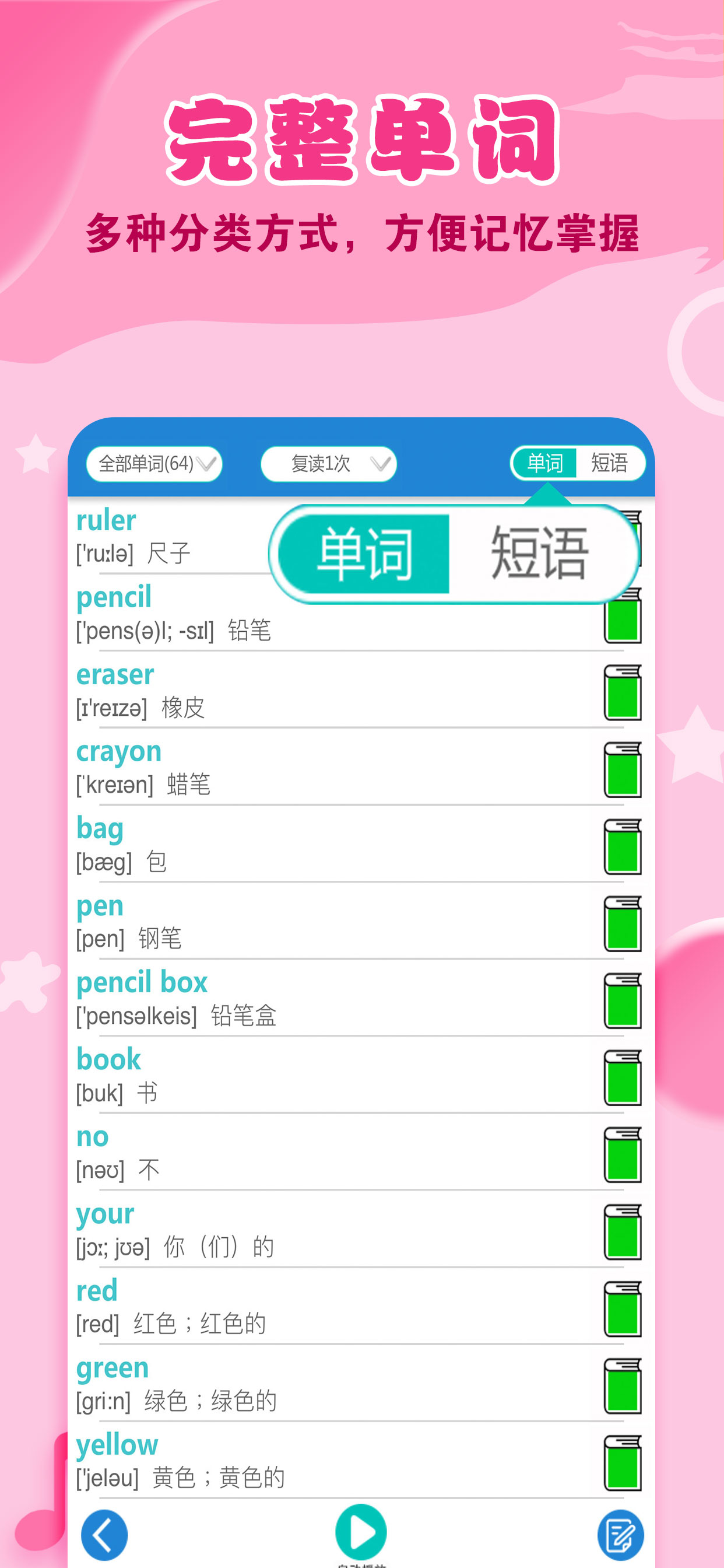 ·功能齐全——点读复读,单词口语整理完备,记录分析学习情况!