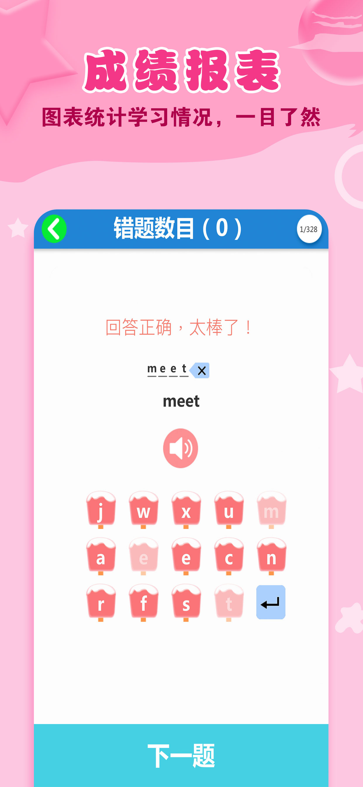 创意设计趣味互动,图表统计学习情况,孩子的学习情况一目了然(学习时间,测试情况,不熟悉的单词)。