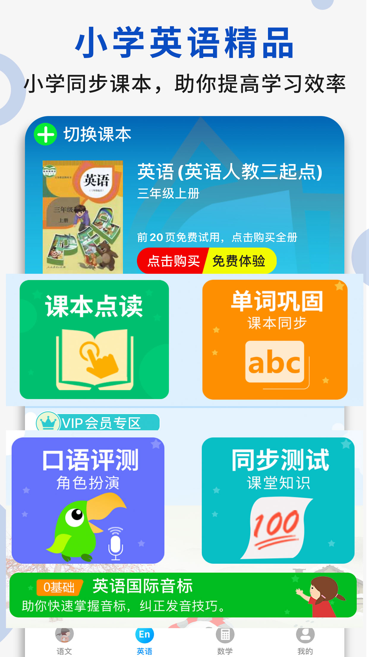 口语训练:课文同步对话,角色扮演、智能评分、矫正发音,让孩子说一口流利的英语。
