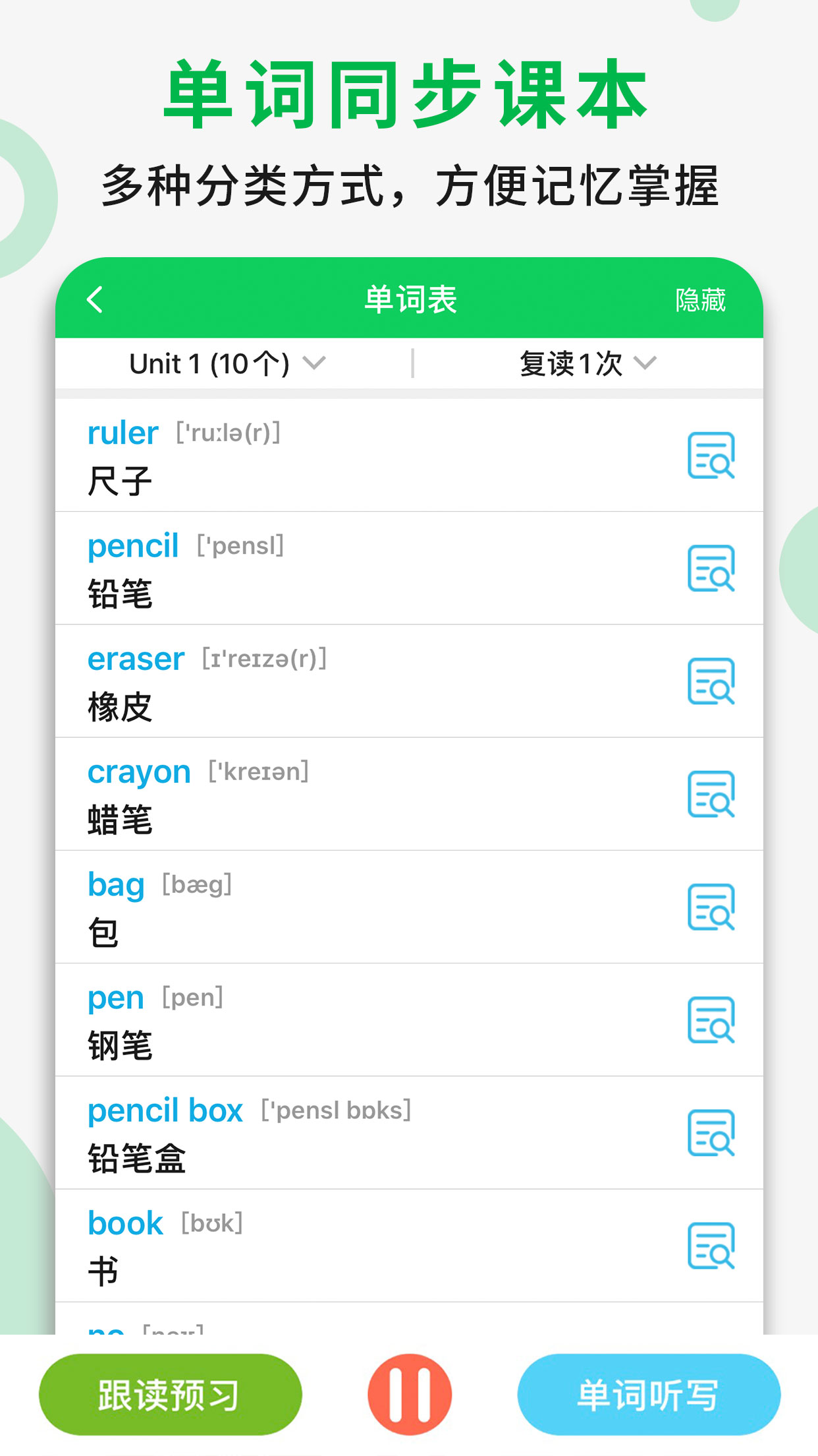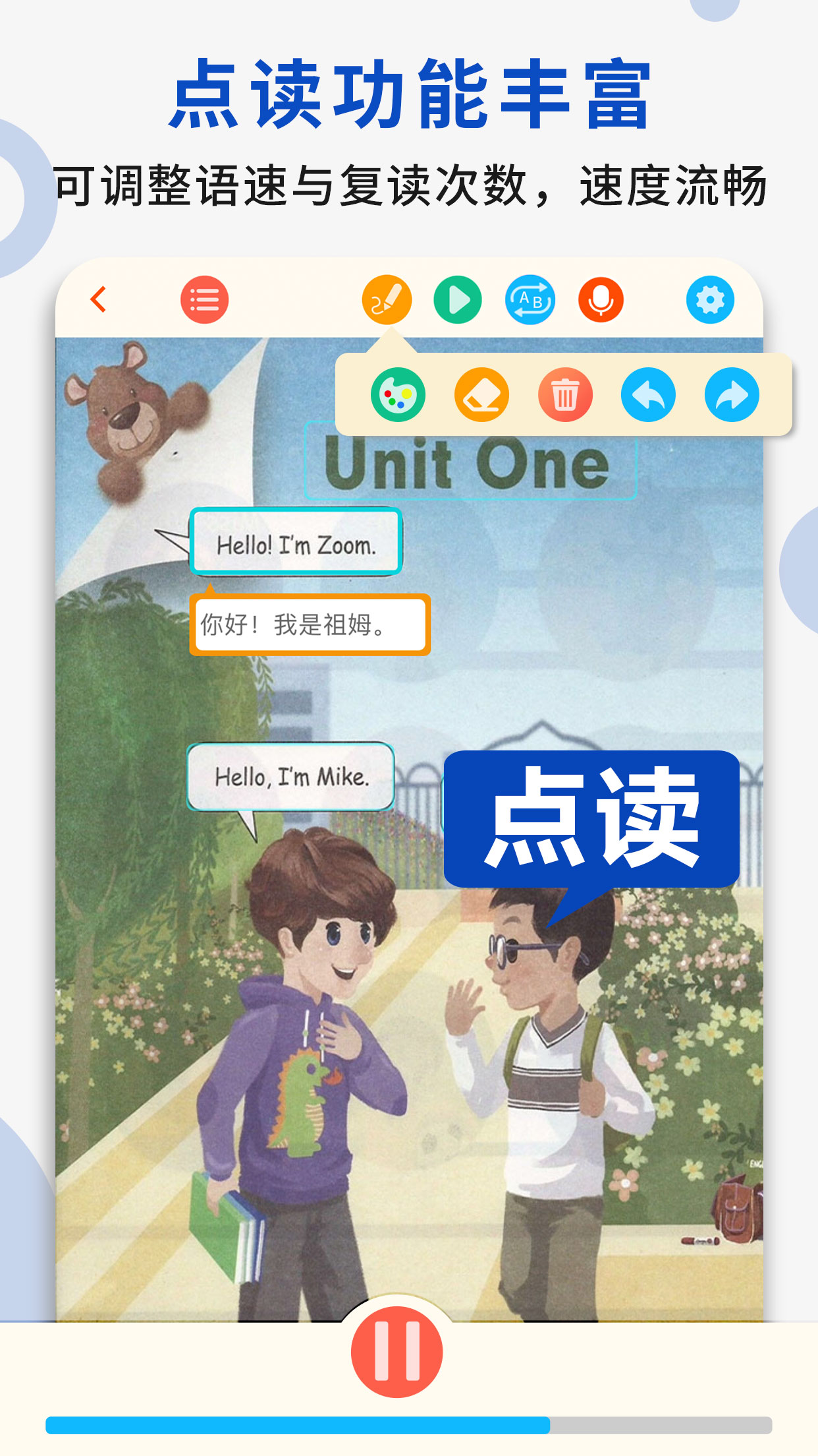课本点读:同步教材、纯正发音、贴心翻译,可点读、连读、复读。