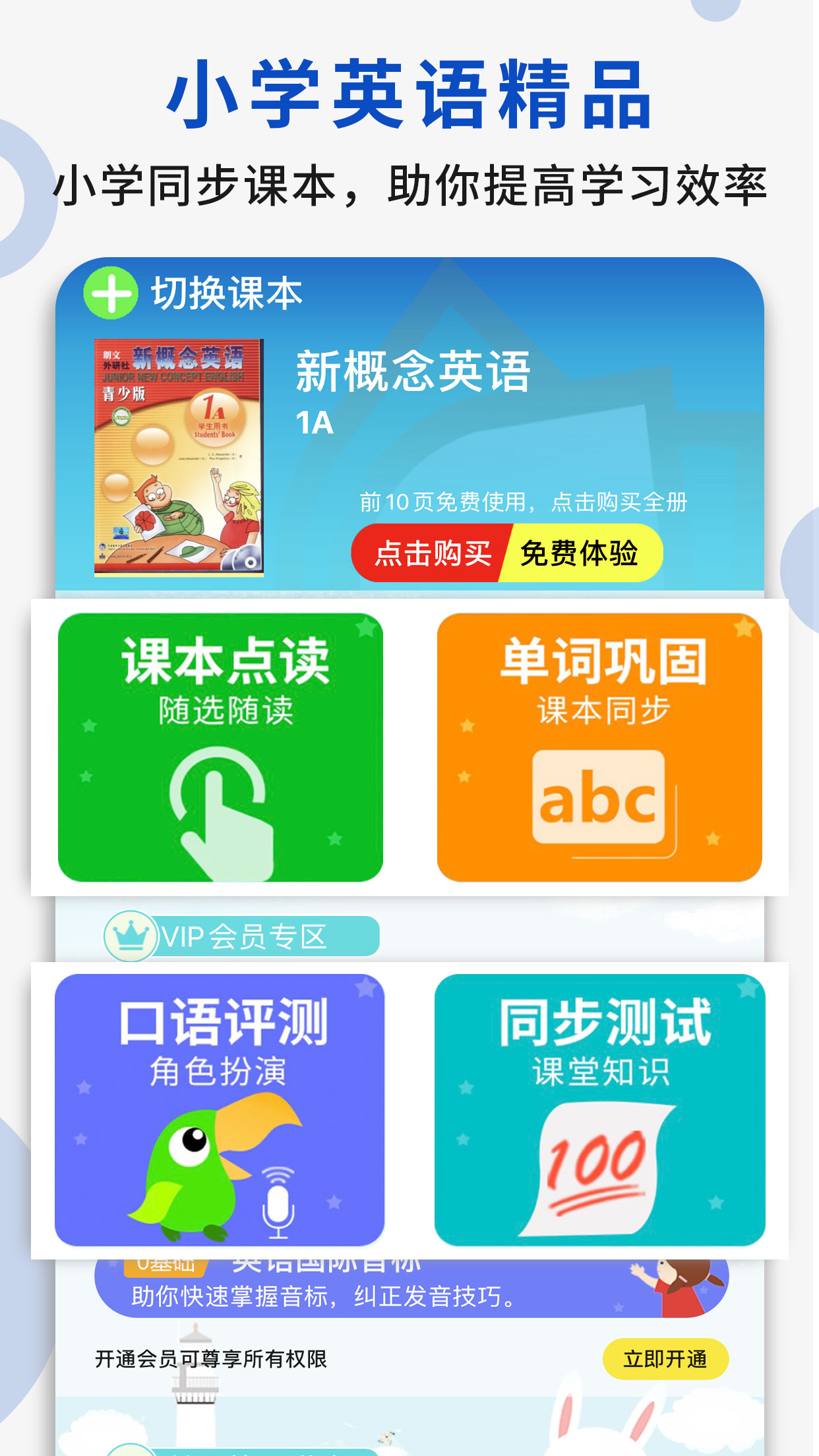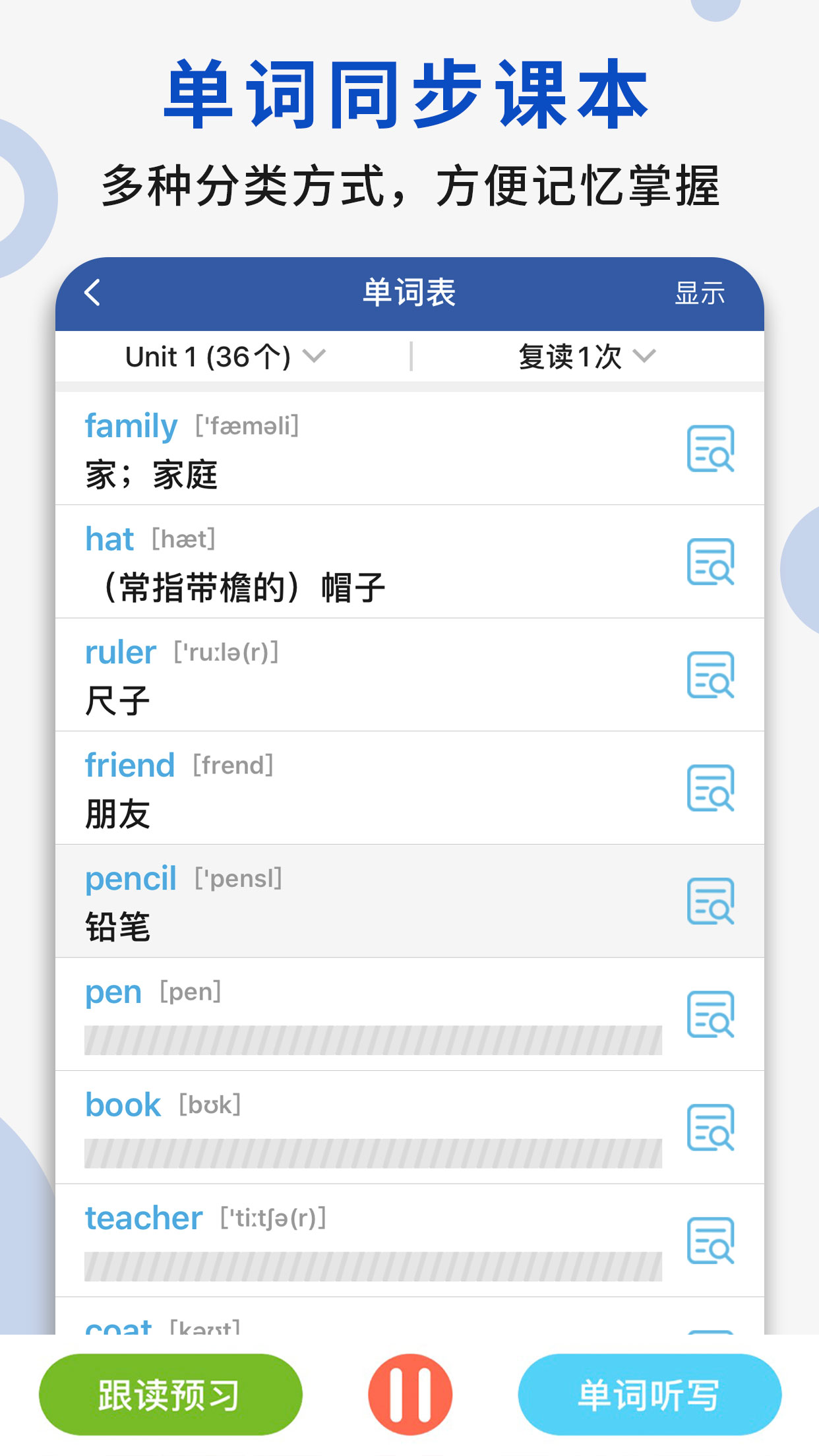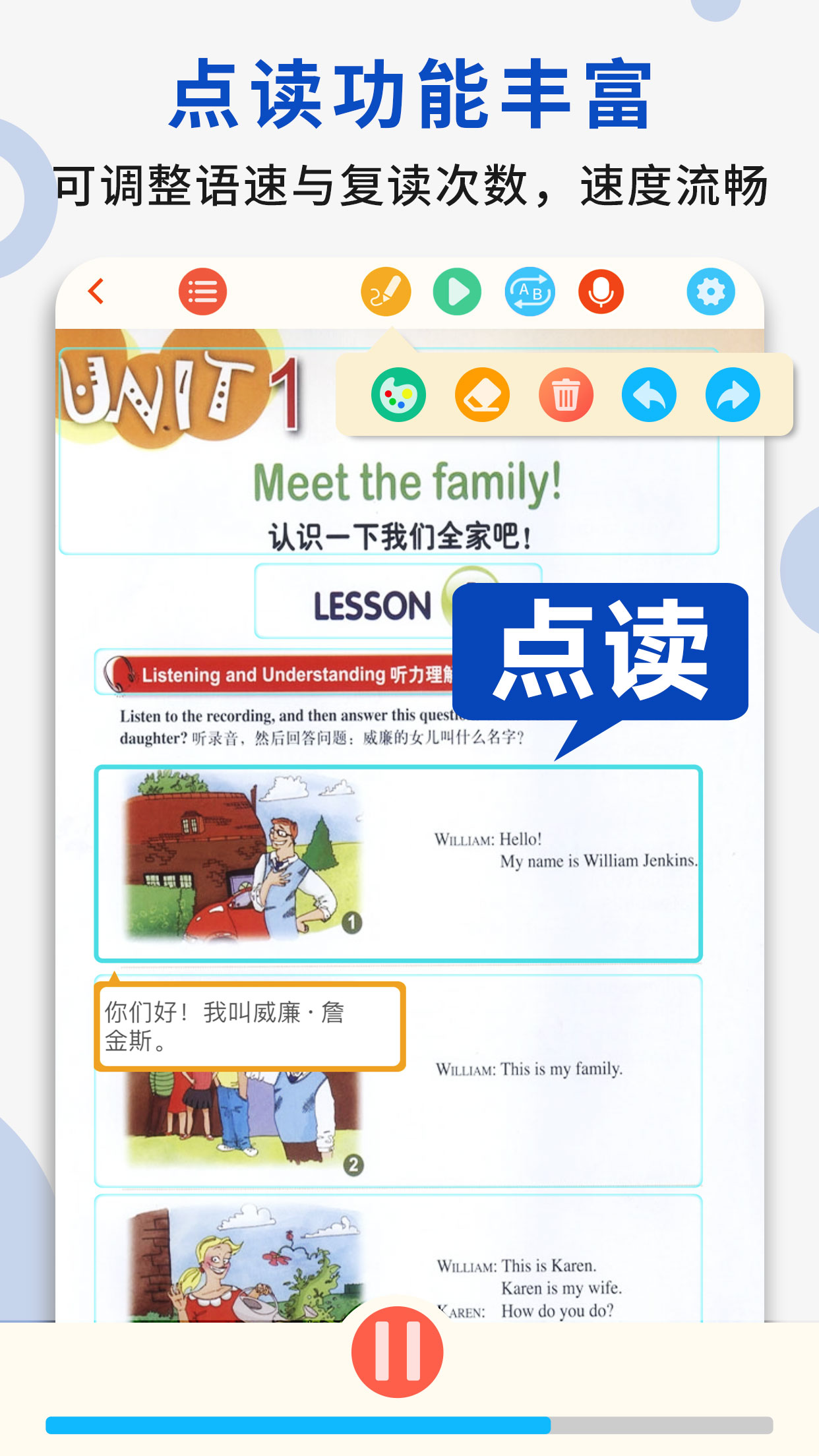 课本点读:同步教材、纯正发音、贴心翻译,可点读、连读、复读。