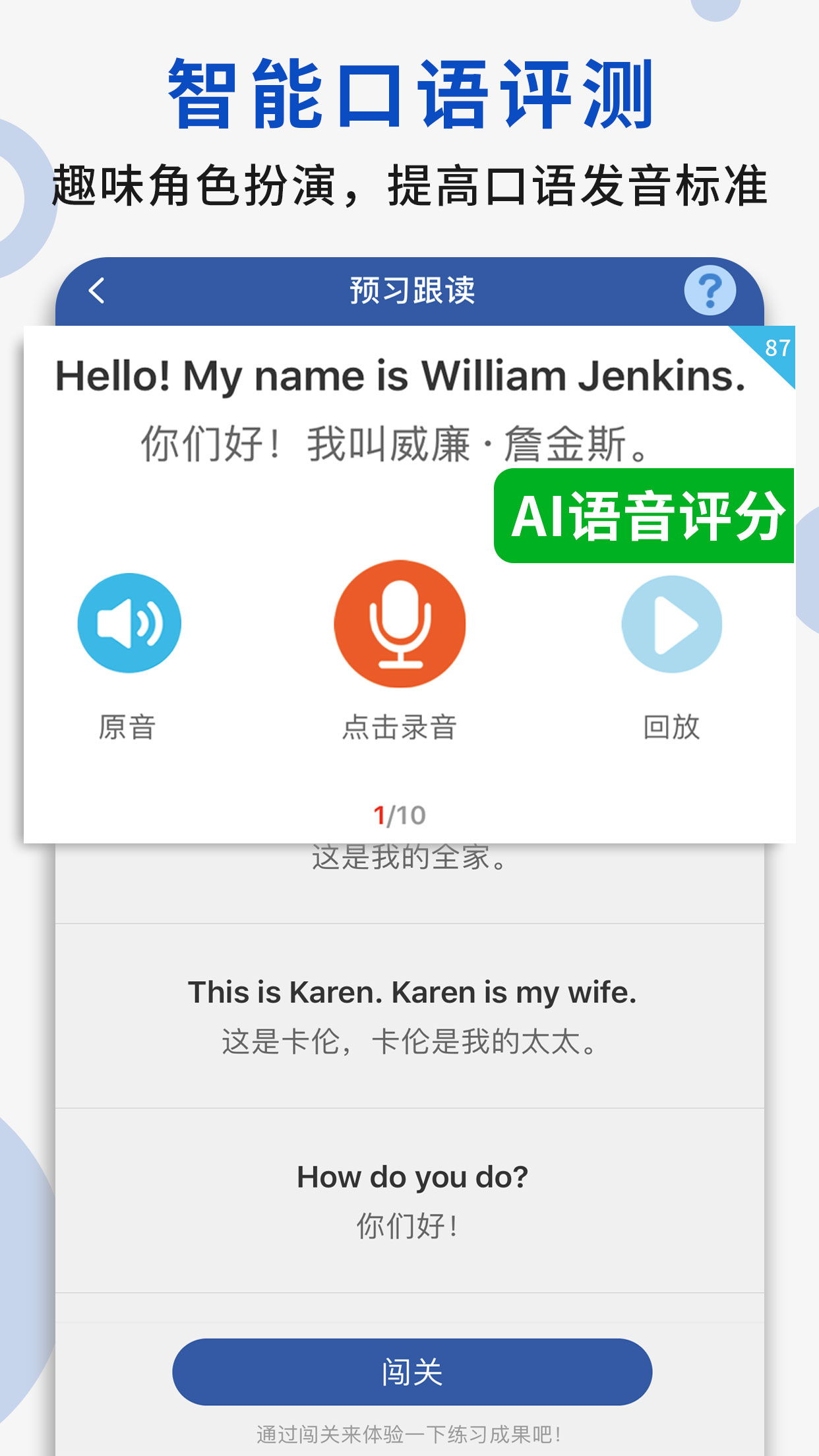 口语训练:课文同步对话,角色扮演、智能评分、矫正发音,让孩子说一口流利的英语。